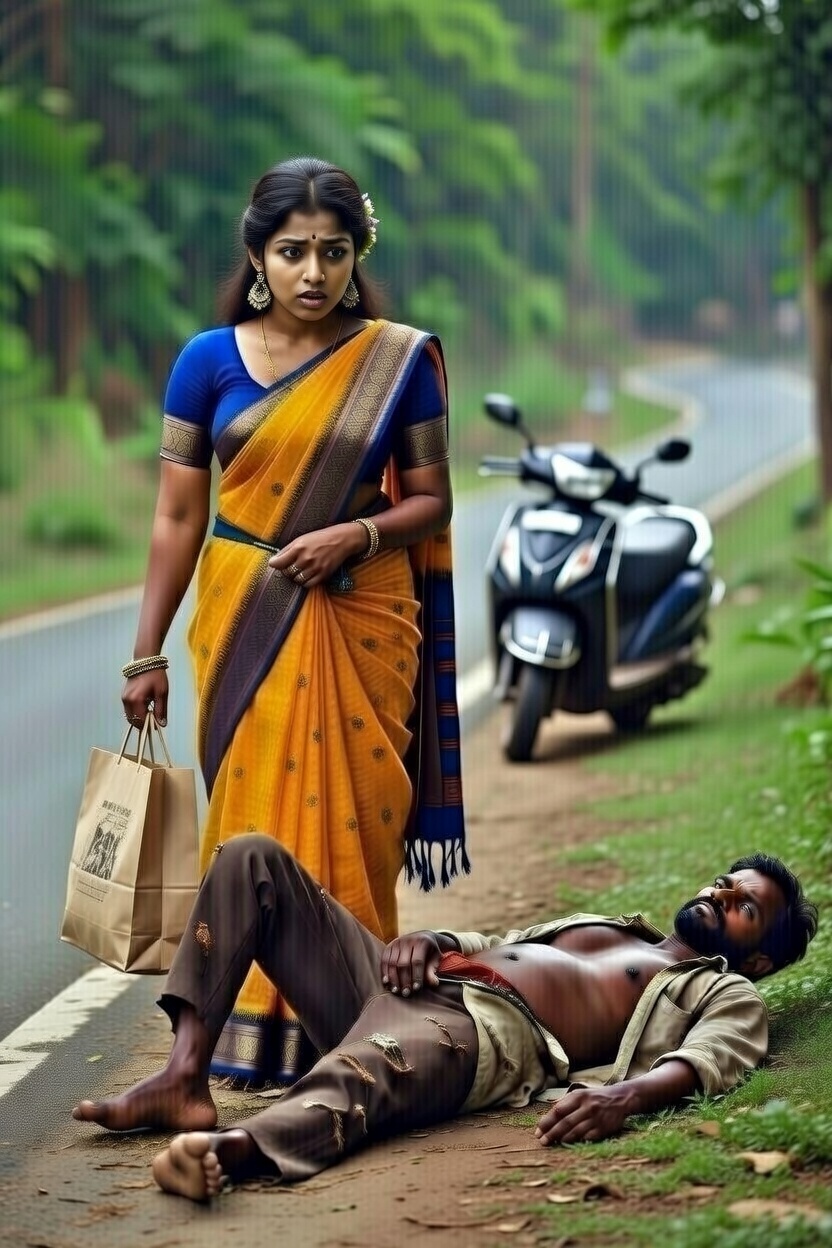 अगले दिन सुबह राजेश ऑफिस चला गया। कोमल ने नाश्ता किया, लेकिन मन नहीं लगा। वो तैयार हुई – एक टाइट ब्लाउज और साड़ी पहनी, जिसमें उसके स@@न उभरे हुए दिख रहे थे। “आज जाऊंगी… देखूंगी वो है या नहीं।” वो बाजार के बहाने निकल पड़ी। सड़क पर पहुंची तो वो भिखारी वही था, उसी जगह लेटा हुआ। आज उसके कपड़े और ज्यादा फटे लग रहे थे, ल@@ड फिर से बाहर, आधा खड़ा। कोमल ने स्कूटी रोकी और उतर गई। वो उसके पास गई, झुककर बोली, “भाई साहब, भूख लगी है? मेरे घर चलो, खाना दूंगी।”