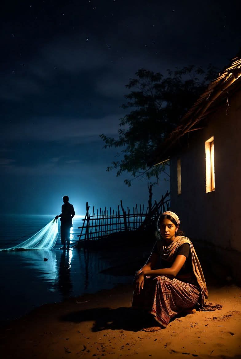 तभी पीछे से किसी की आवाज आई। “रिया… इतनी रात में बाहर?” रिया मुड़ी। सामने अरुण खड़ा था – गांव का मछुआरा, जिसकी नाव दिन में उसे समंदर पर ले गई थी। अरुण का शरीर मजबूत था, धूप से झुलसा हुआ, बाल समंदर के पानी से गीले, और आँखों में एक गहरी, जंगली चमक। उसके कपड़े भी भीगे हुए थे, शरीर से चिपके हुए – हर मांसपेशी साफ दिख रही थी। “नाव में पानी भर गया… मैं यहां रुक सकता हूं? बाहर तूफान है।” उसकी आवाज में एक कच्ची, भूखी गर्माहट थी। रिया ने कुछ नहीं कहा। बस दरवाजा खुला छोड़ दिया और अंदर चली गई। उसका मन डर रहा था, लेकिन शरीर पहले से ही उसकी तरफ खिंच रहा था।